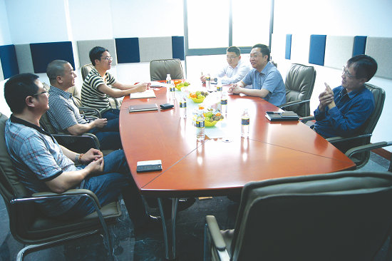 ??趪腋咝聟^(qū)領(lǐng)導(dǎo)一行(右)與公司領(lǐng)導(dǎo)(左)在會議室親切交談