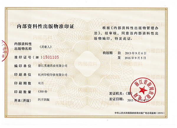 浙江省新聞出版廣電局授予《靈康人》內(nèi)部資料性出版物刊