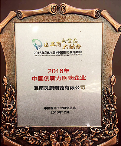 海南靈康制藥有限公司榮獲“2016 年中國創(chuàng)新力醫(yī)藥企業(yè)”稱號